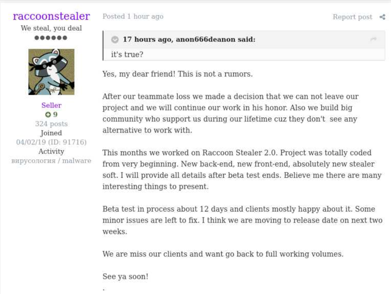 In July 2022, the administrators of Racoon Stealer released the second version of the info stealer, Racoon stealer V2. Unlike the original version, the new version is written in C instead of C++. It has multiple positive reviews from the hacking community as it inherited all the capabilities of the original stealer along with the elevated stealing and evasion functionalities.